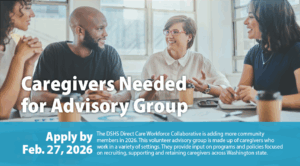 The Washington State Department of Social and Health Services (DSHS) is currently seeking caregivers to join the Direct Care Workforce Collaborative (DCWC) in 2026. The DCWC is a volunteer advisory group made up of caregivers from a variety of long-term care settings who provide input on programs and policies focused on recruiting, supporting, and retaining the direct care workforce across Washington state.